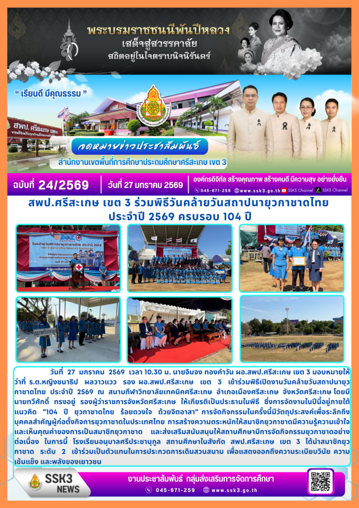 สพป.ศรีสะเกษ เขต 3 ร่วมพิธีวันคล้ายวันสถาปนายุวกาชาดไทย ประจำปี 2569 ครบรอบ 104 ปี มีนาคม 10, 2026 Last updated : มีนาคม 10, 2026 Chanyaphat001 Post Views: 20