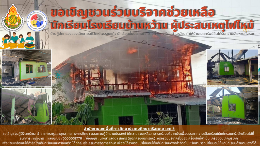 เขตพื้นที่การศึกษาประถมศึกษาศรีสะเกษ เขต ๓ ขอเชิญชวนผู้มีจิตศรัทธา ข้าราชการครูและบุคลากรทางการศึกษา ตลอดจนผู้มีความประสงค์ ให้ความช่วยเหลือสามารถร่วมบริจาคเงินเพื่อบรรเทาความเดือดร้อนให้แก่ครอบครัวนักเรียนและครอบครัวประสบเหตุอัคคีภัย บ้านของเด็กชายอภิวัฒน์ วรรณแก้ว นักเรียนชั้น ป. 3 โรงเรียนบ้านหว้าน ต.สำโรงปราสาท อ.ปรางค์กู่ จ.ศรีสะเกษ
